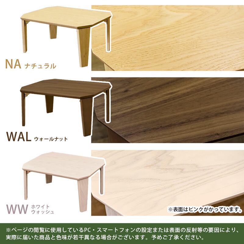 このテーブルは、ナチュラル(NA)とウォールナット(WAL)、ホワイト(WW)の3色が織りなす美しいカラーリングが特徴です。どの色もお部屋に温かみをプラスしてくれ、カジュアルな雰囲気からスタイリッシュな空間まで、お好みに合わせて楽しむことができます。また、折り畳み式のため、使わない時にはコンパクトに収納でき、スペースを無駄にすることなく活用できます。60cmのサイズは、ダイニングやリビングルーム、さらにはテラスなど、さまざまな場所で使うのに最適です。