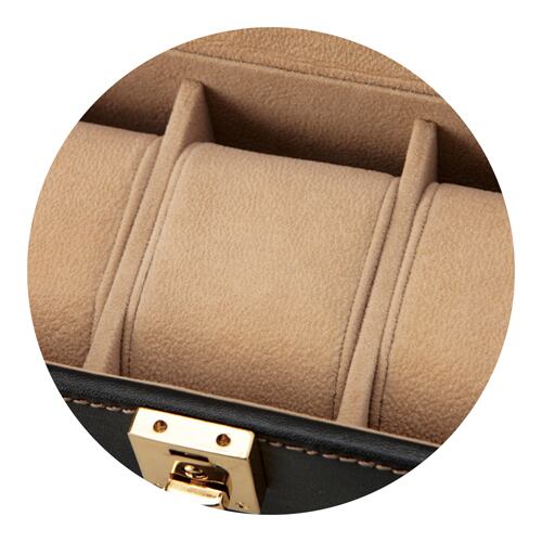 5本の時計を収納できるため、お気に入りの時計をきれいに並べて展示できます。内部は柔らかい素材が施されており、大切な時計を傷から守る安心設計です。また、巻いて収納できるため、自動巻き時計のメンテナンスにも最適です。