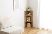 このコーナーラックは、コンパクトなデザインながら高い収納力を持ち、雑誌や植物、小物などさまざまなアイテムを美しく整理することが可能です。木目調の素材感は温かみを感じさせ、どんなインテリアとも調和します。組み立て式で、組み立て時間は約15分ですので、手軽にお部屋に取り入れることができます。