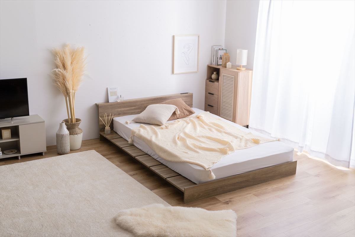 このローベッドのすのこ構造は、優れた通気性を実現し、湿気を防ぐ工夫が施されています。ヘッドボード付きのデザインは、読書やスマートフォン操作など、リラックスした時間をより快適に過ごすためのサポートをします。また、低床型のデザインが圧迫感を軽減し、開放感のあるお部屋作りに貢献します。