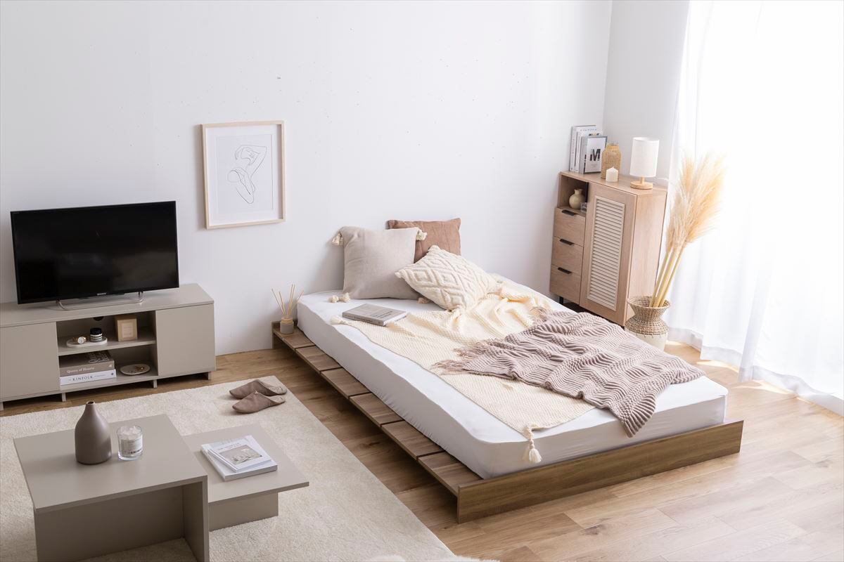 こちらのローベッドにはマットレスは含まれておりませんので、別途お求めください。理想的な寝具と共に素敵な眠りの時間をお楽しみいただけます。