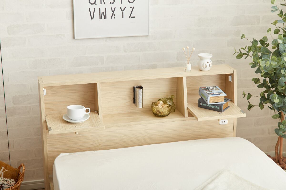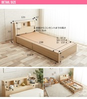 ヘッドボードに照明、コンセント、収納棚が付き、キャスター付の引出しまで付いた収納付ベッド。
